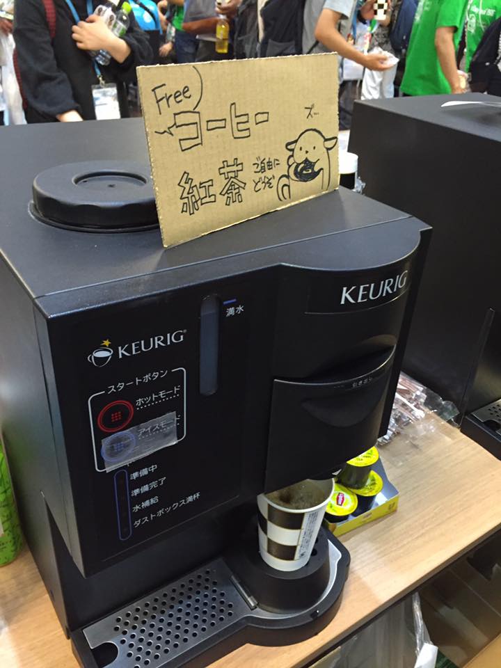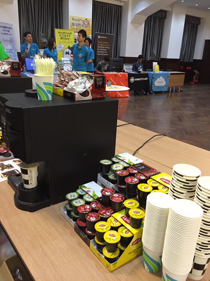 セルフサービスでキューリグのマシーンから温かいお飲み物を提供する方式になります。これは今年の WordCamp Kansai でも行っていたのですが、とても嬉しい心遣いでしたので情報を共有してもらい東京でも採用することになりました。